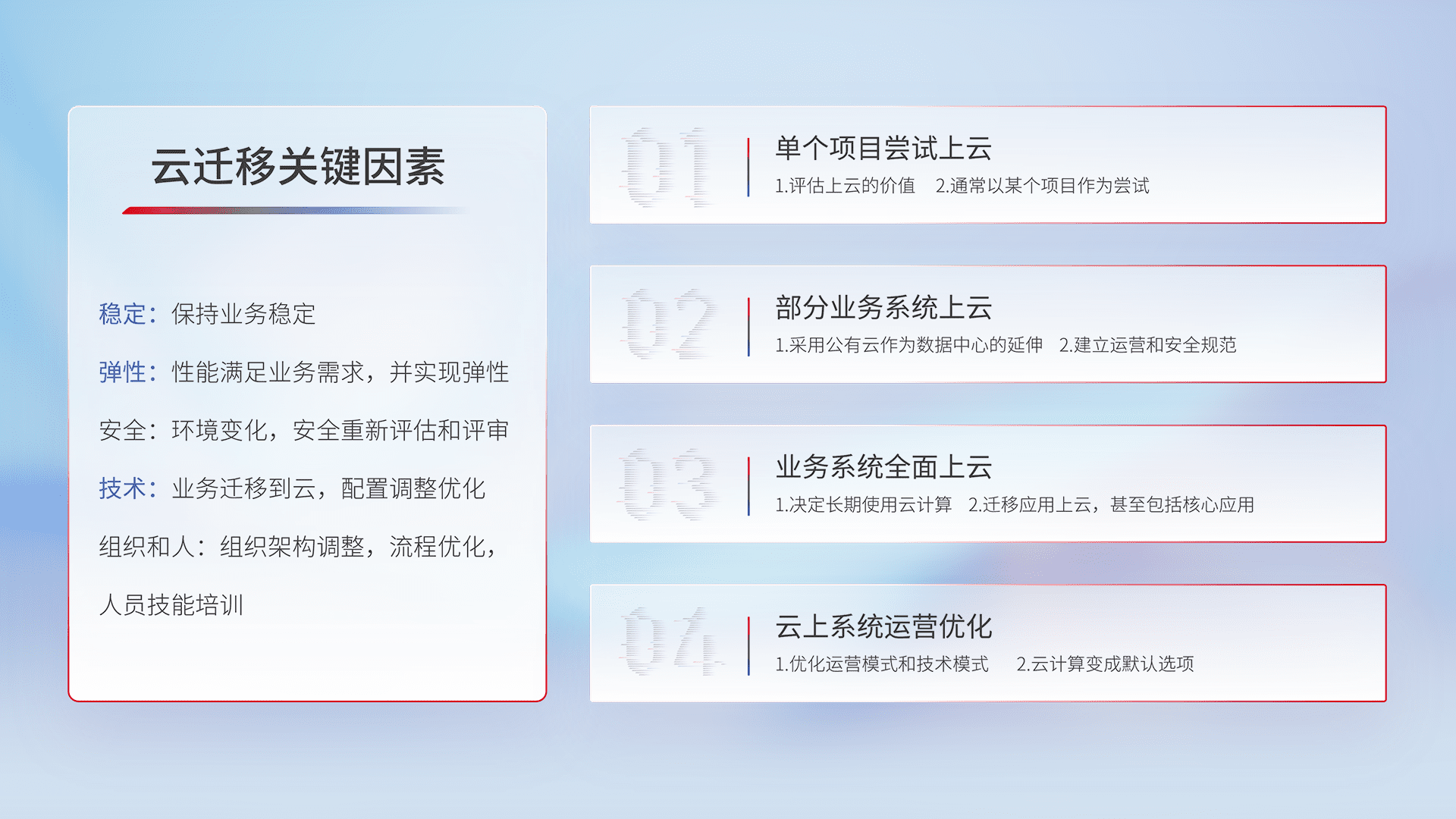 结合实际业务,,,从规划设计、、、云平台选型、、、云原生改造、、、数据迁移、、、、集成交付,,,迁移全过程为客户识别最佳上云路径,,,,做好风险识别管理,,设计网络架构、、、身份权限、、、、安全审计合规、、操作审计、、、、日志审计、、监控告警策略、、、、多站点容灾设计等,,,对云上基础设施进行整体规划,,,,提升IT治理水平,,,,以满足弹性、、、高可用、、、高性能的需求。。。。